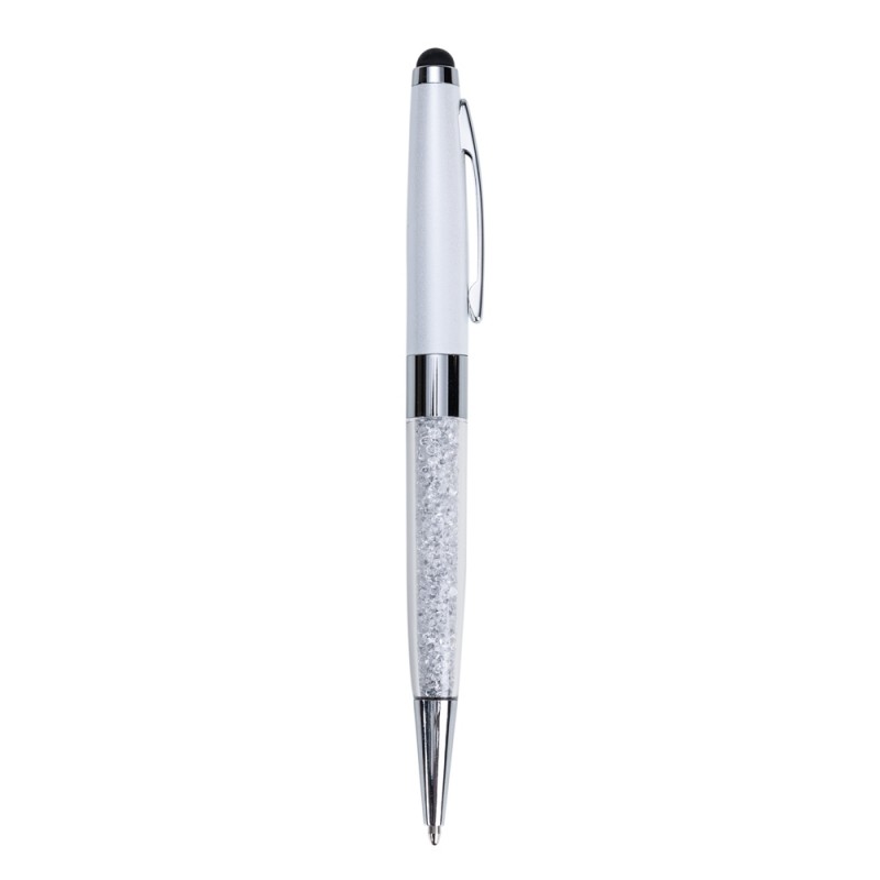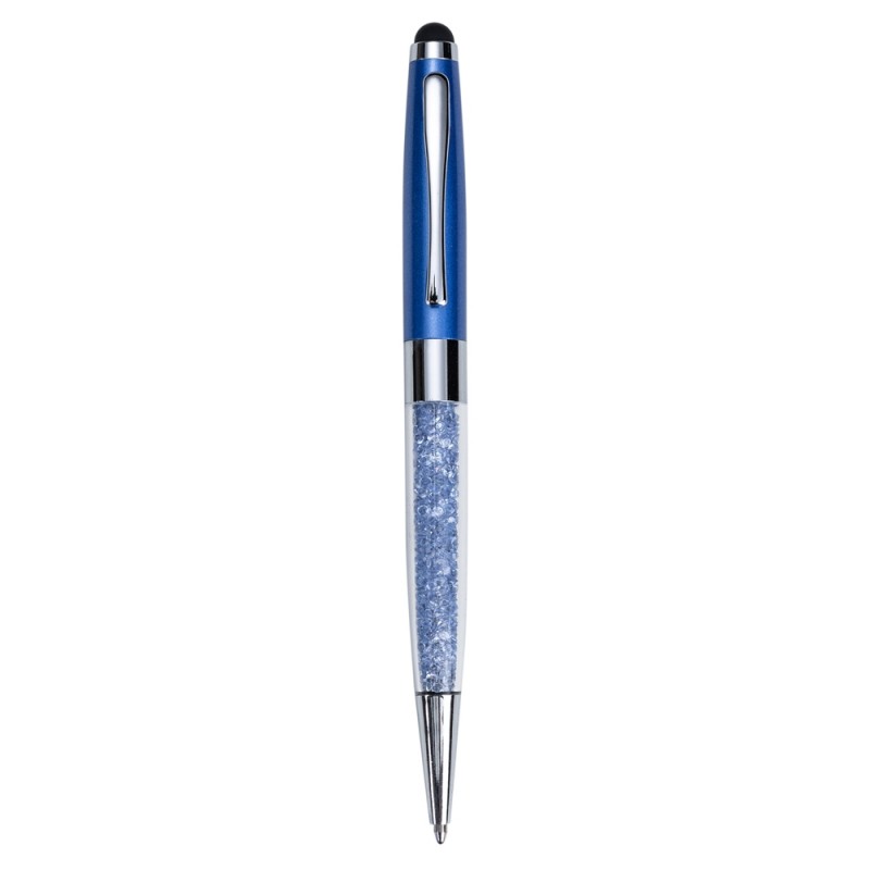 Caneta metal touch, parte inferior em plástico transparente com cristais(swarovski) interno. Clip metal e ponteira touch superior, cristal da mesma cor que o detalhe colorido da parte inferior.