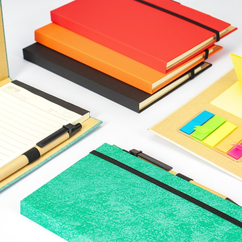 Bloco de anotações com capa dura revestida em papel especial e fita elástica para fechamento, com cerca de 80 folhas pautadas, e um bloco com aproximadamente 20 folhas autoadesivas amarelas e por volta de 100 marcadores de página autoadesivos. Acompanha uma caneta esferográfica com carga azul.