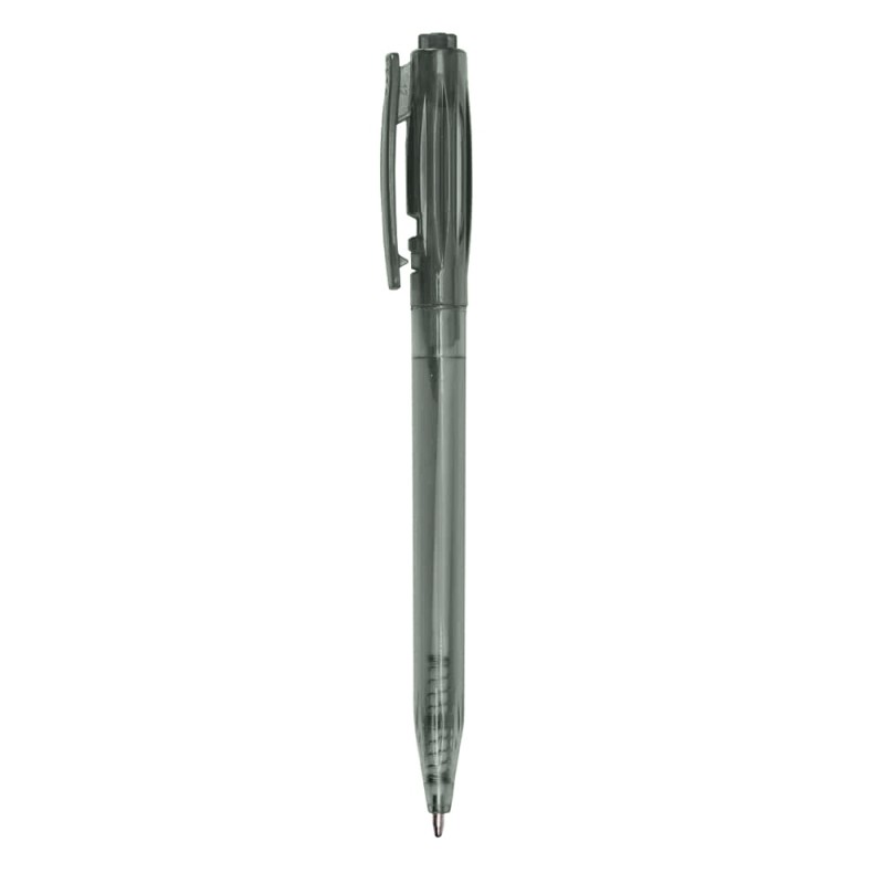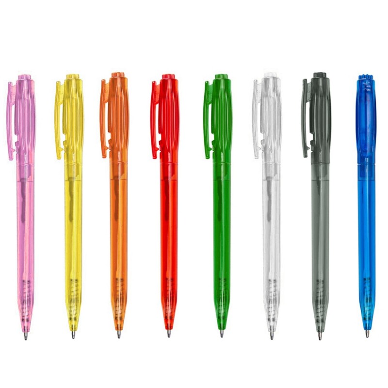 Caneta plástica inteira colorido. Possui detalhes em relevo na parte superior ao redor do clip, parte inferior com detalhes em relevo. Aciona por clique e para destravar basta apertar a parte inferior do clip.