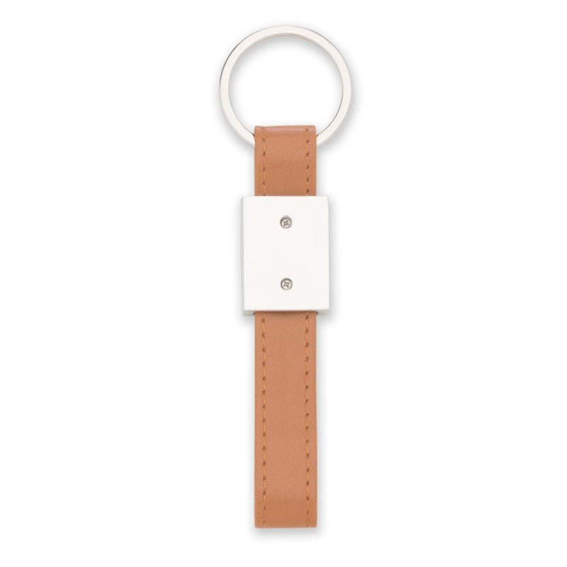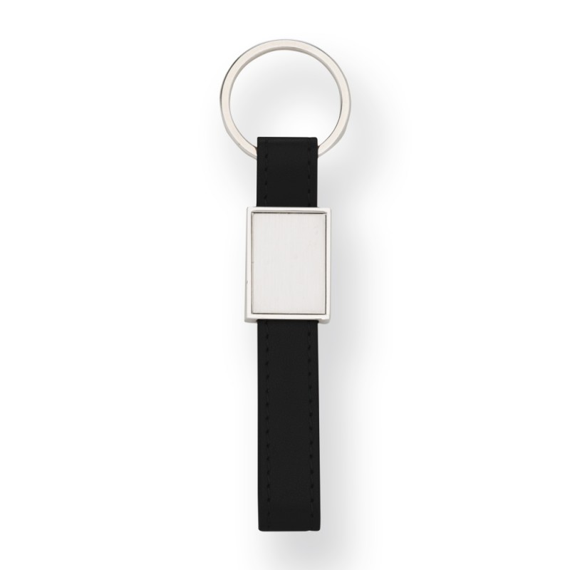 Chaveiro de metal quadrado com alça emborrachada e detalhes de costura. Possui chapa frontal em metal e verso liso com detalhe dos parafusos.