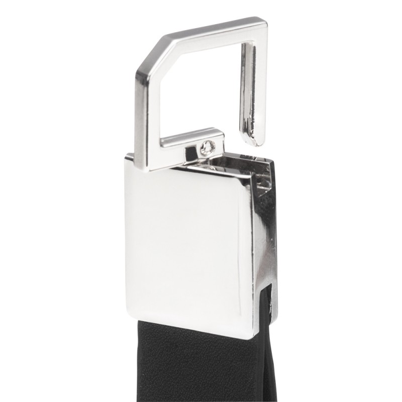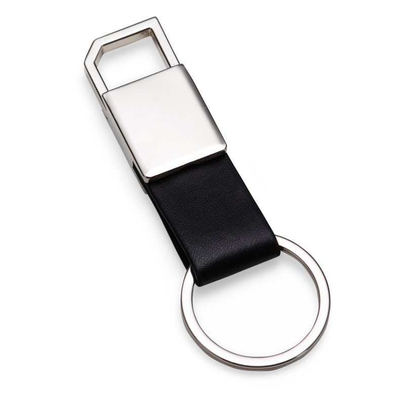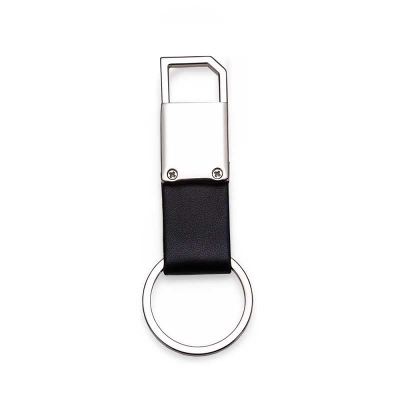 Chaveiro metal com detalhe em couro sintético e mosquetão giratório. Frente lisa e parafusos no verso, “mosquetão” giratório, basta puxar para cima para rotacioná-lo.