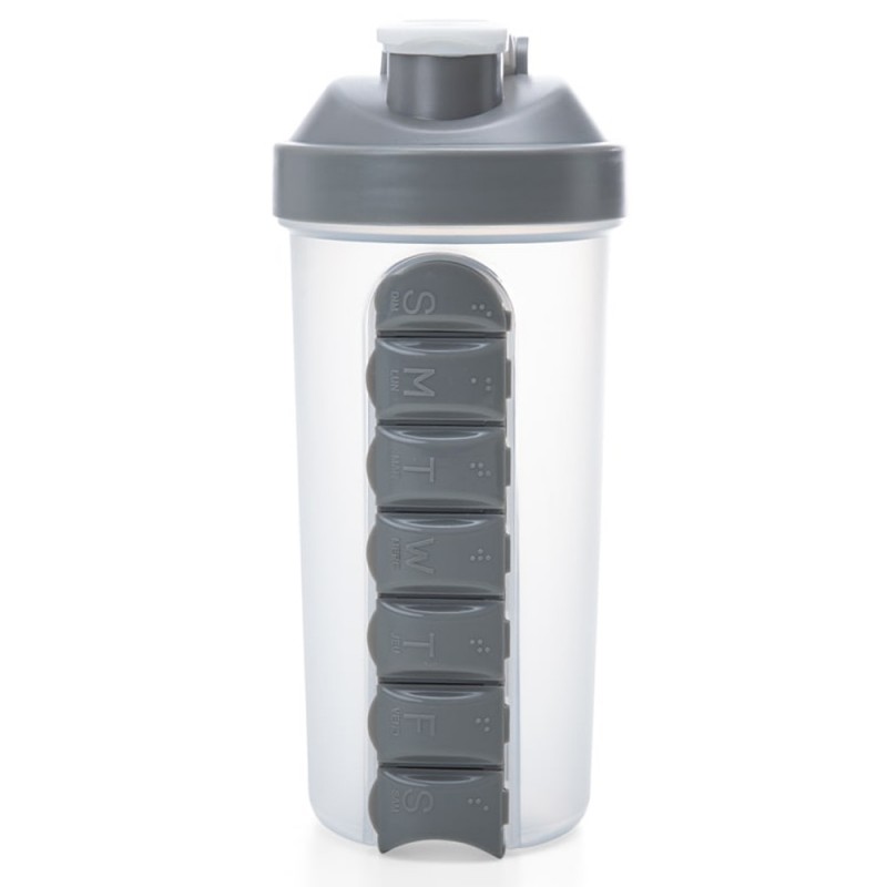 Coqueteleira plástica 750ml com porta comprimido. Copo transparente fosco com medição em ml e oz(600ml e 20oz), apesar do copo constar esta medição ele suporta até 750ml(ultrapassa a marcação); parte frontal com pequenas portas especificadas com os dias da semana em siglas inglês/francês, basta levantar/abrir à direita para a abertura de cada compartimento. Tampa de rosca com pequena alça regulável e tampa protetora para o bocal.