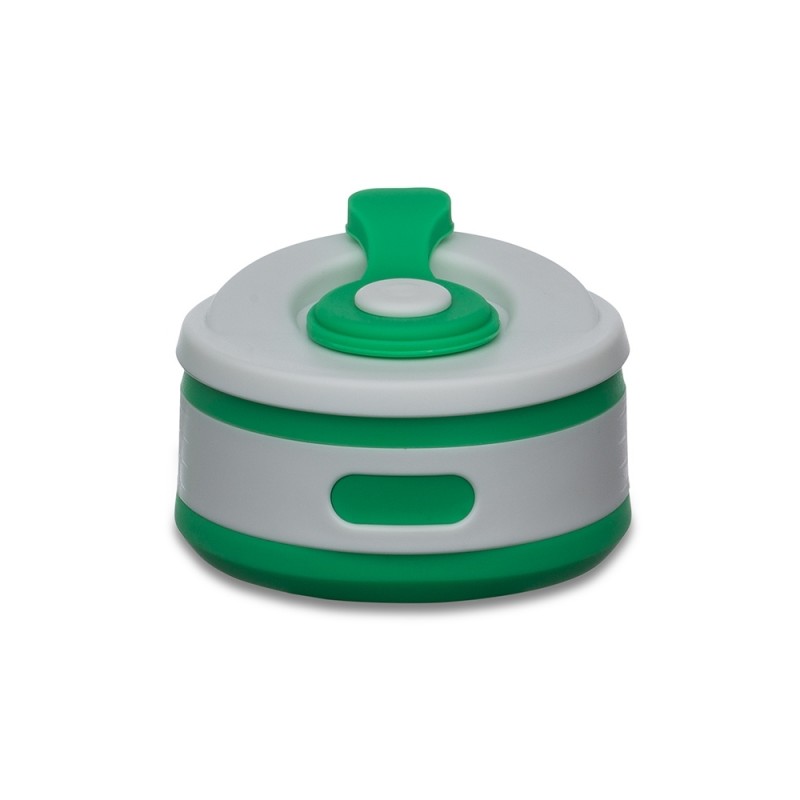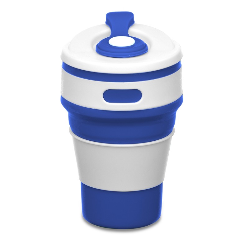 Copo retrátil 350ml de silicone, livre de BPA. Tampa plástica de encaixe com abertura para o bocal, acompanha "luva" plástica branca, evitando queimar as mãos com líquido quente - também pode ser utilizada como suporte para sustentacão do copo.