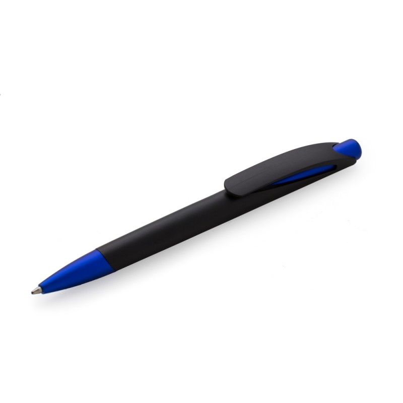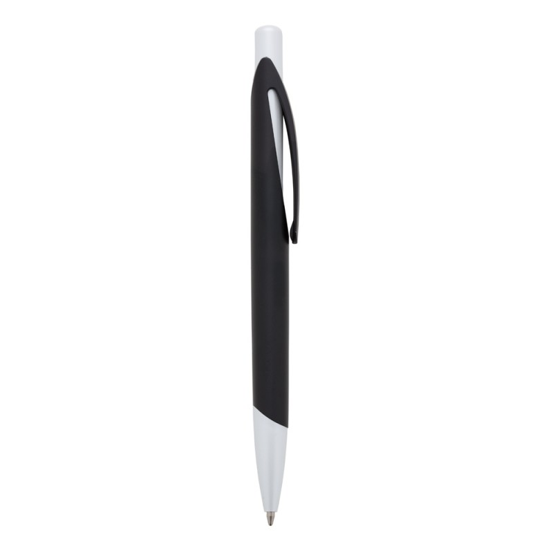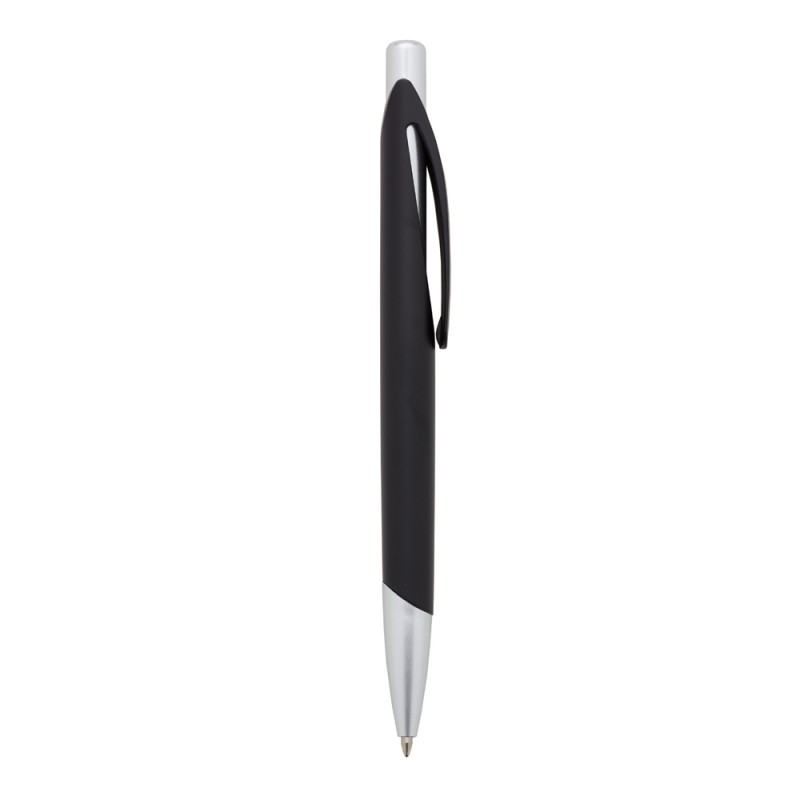 Caneta plástica preta fosca com detalhes coloridos. Clip plástico com detalhe vazado interno, aciona por clique.