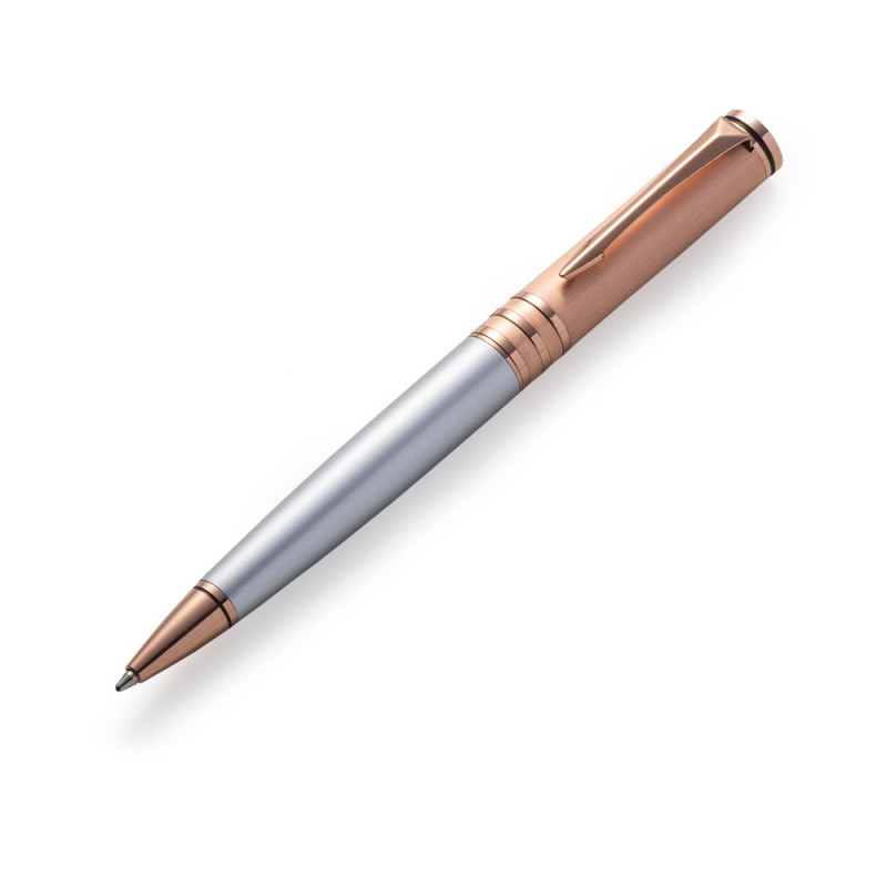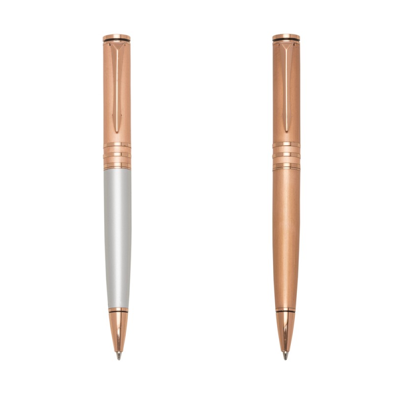 Caneta metal cobre com detalhes coloridos. Clip metal e anel em relevo na parte superior, possui três anéis centrais e parte inferior colorida. Aciona por giro, possui anel em relevo na ponteira. PEDIDO APENAS MÚLTIPLO DE 50 PEÇAS!