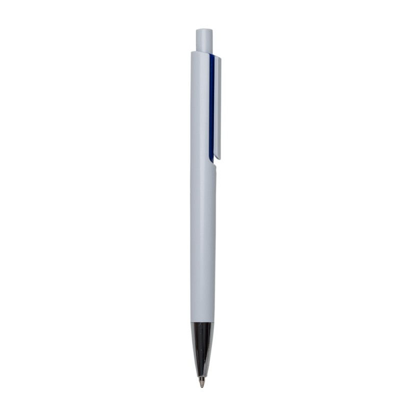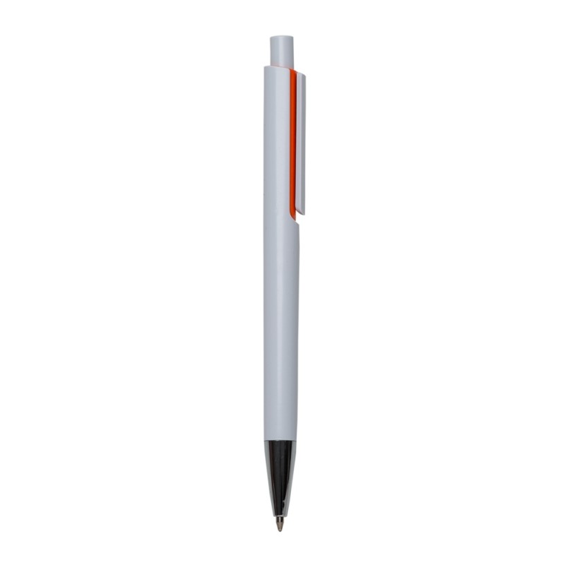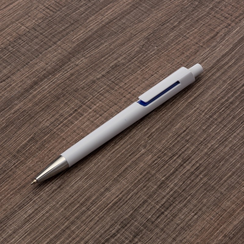 Caneta plástica inteira branca com detalhes coloridos. Clip plástico com detalhe vazado, possui ponteira cromada. Aciona por clique. PEDIDO MÚLTIPLO DE 100 PEÇAS!
