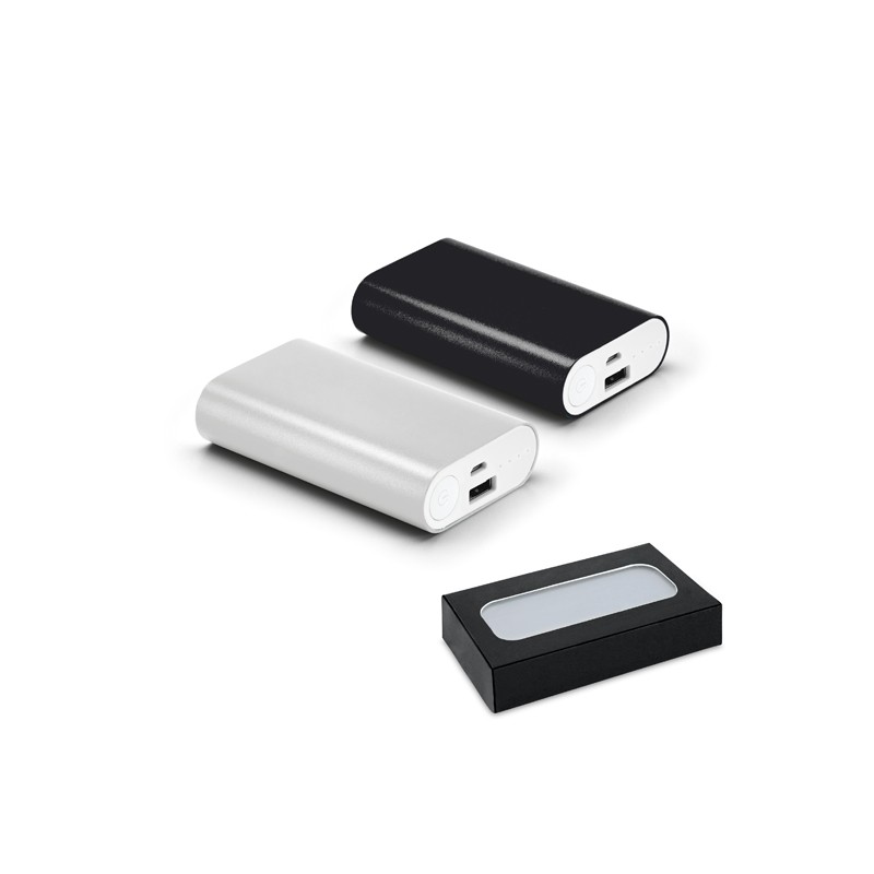 Bateria portátil. Alumínio. Bateria de lítio. Capacidade: 5.200 mAh. Tempo de vida ≥ 500 ciclos. Com entrada/saída 5V/1A. Incluso cabo USB/micro USB para carregar a bateria.