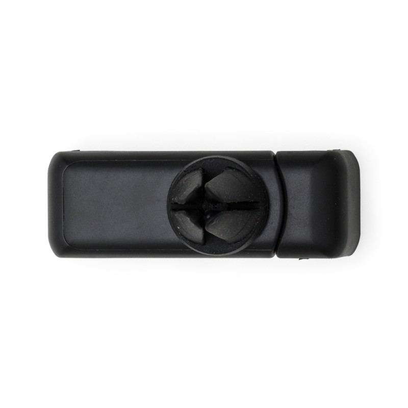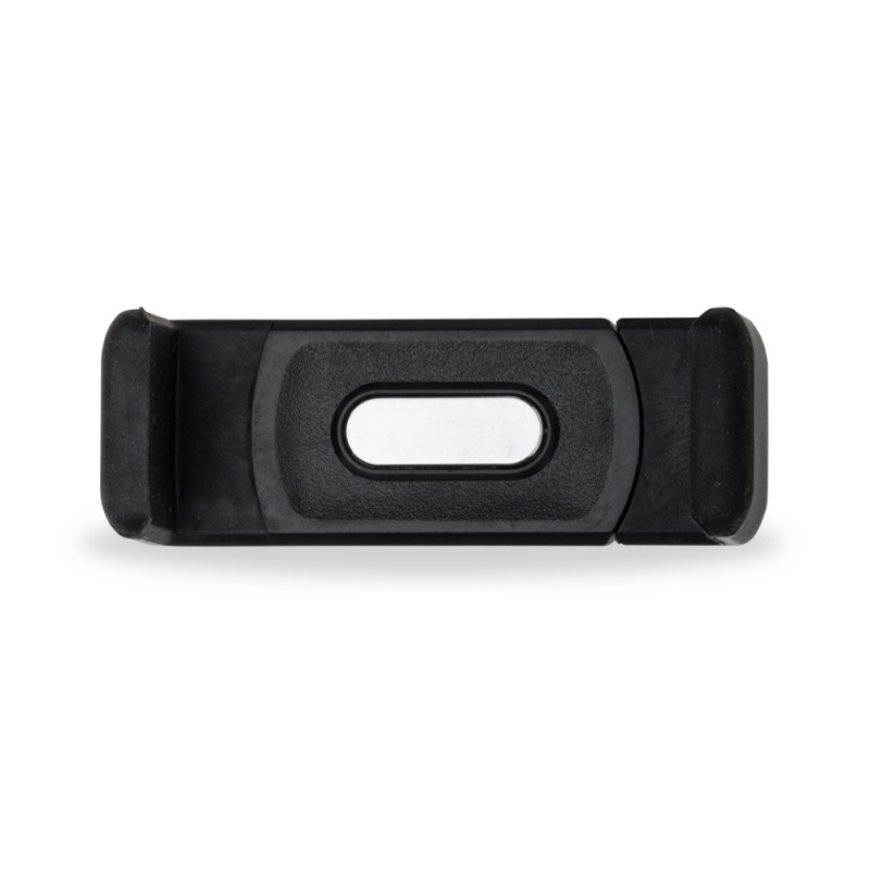Suporte veicular para celular. Material plástico de hastes ajustáveis para encaixe do celular, possui “plaquinha” plástica de cor prata na área interna. Parte traseira com garra emborrachada para ser acoplada na grade de ventilaçao do veículo.