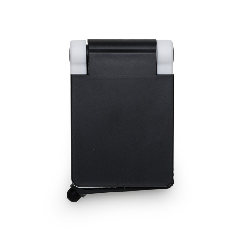 Base para celular com borracha touch e limpador de tela. Material plástico branco com detalhes coloridos, para uso do suporte basta rotacionar a base grande colorida para o lado oposto, para uso do limpador de tela basta puxar pela lateral o compartimento que possui a borracha touch.